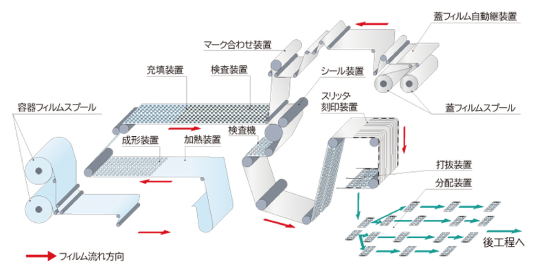 本技術は、当社製ブリスター包装機FBP-600Eシリーズへの新規搭載はもちろん、既存の生産機にも改造で設備導入をしやすくしている。また、従来と同等の生産能力と、内容物を保護するために必要な包装性能を確保している。