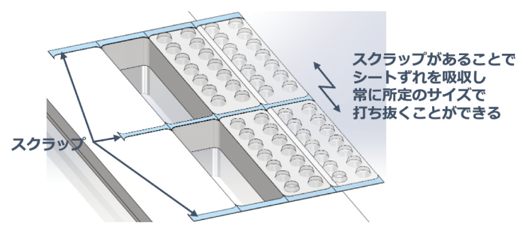 また、PTPシートの角部はR形状であり、スクラップのない状態で打ち抜くと、このR部の外周で微小な三角片(以下、三角スクラップ)が切り出される。三角スクラップがPTPシートに付着したまま流出すると異物混入につながるため、それを確実に回収する仕組みも必要となる。