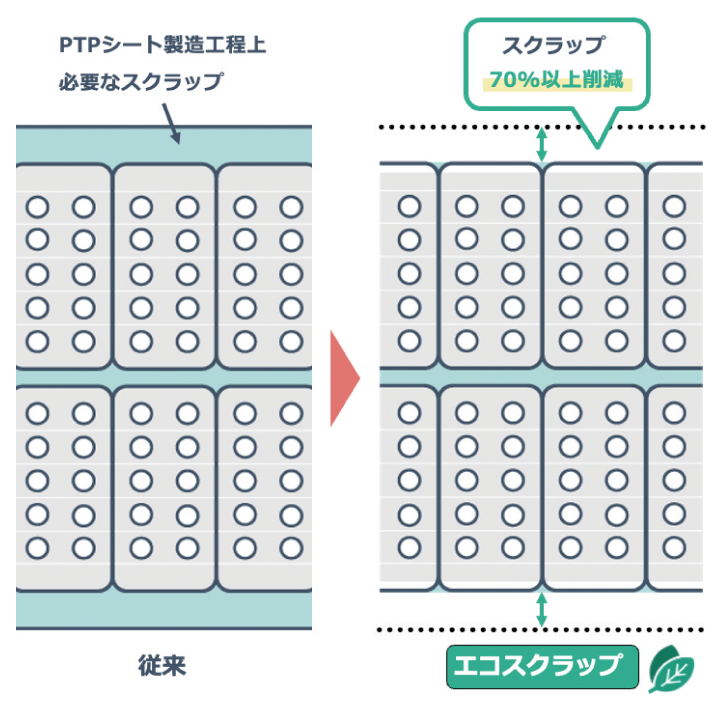 In recent years, national environmental policies centered on waste reduction (Reduce) have accelerated, and the realization of sustainability has been strongly demanded even in the packaging field. In the PTP packaging process, the generation of scrap has long been tolerated as unavoidable in manufacturing, since it is necessary to absorb misalignment caused by meandering during conveyance or thermal expansion and contraction. However, with the growing societal demand for carbon neutrality, reducing scrap has become an important challenge. To address this, we developed the world’s first “Eco-Scrap Technology,” which combines high-precision automatic correction of web film meandering with triangular scrap collection technology. This enables a reduction of more than 70% in scrap discharge compared to conventional methods, and a reduction of more than 7% in the amount of web film and lid foil used. PTP sheets manufactured with this technology are called “ClearE-Sheet®” and feature a new design that allows users to feel their contribution to the SDGs. Through case studies, it has been introduced that Eco-Scrap Technology is an effective means of putting Reduce into practice.