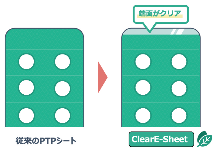 エコスクラップ®技術を用いて製造したPTPシートをClearE-Sheet®(読み方:クリア・イー・シート)と呼称する。ClearE-Sheet®は、Fig. 4に示す端面が透明(Clear)なPTPシートであり、余分なスクラップを出すことなく(Clear)、環境に優しい(Eco friendly)PTPシートを意味する。また、従来のPTPシートとは見た目が異なるクリア端面により、環境対応製品であることを使用者が視覚的に認識できる新デザインとなっている。