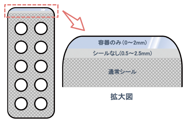 エコスクラップ®技術では、両端のスクラップを削減して容器フィルム端面までをPTPシートの製品範囲とするため、容器フィルムと蓋フィルムの位置関係がPTPシートの外観品質に直結する。両フィルムは独立搬送され、シールポジションで貼り合わされるが、フィルム幅を同一にするとフィルムがずれた際に蓋フィルムが容器フィルムからはみ出し、貼り合わせ不良を招くおそれがある。ClearE-Sheet®は、この問題を回避するため、容器フィルムより蓋フィルム幅をわずかに狭める設計とし、蓋フィルムのはみ出し防止を図っている。貼り合わせ不良を生じさせることなくシールが可能となり、製造されたPTPシート端面は容器フィルムのみとなる。ClearE-Sheet®は、クリア端面部(容器フィルムのみが露出)、シールなし部、および通常シール部の3つの要素から構成され、その概要をFig. 5に示す。