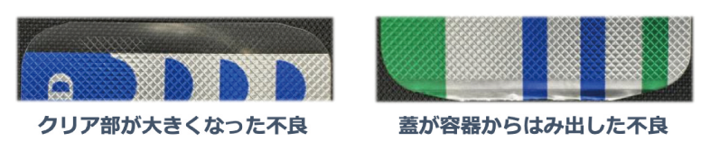 エコスクラップ®を導入した場合、容器フィルムが蛇行するとFig. 6に示すように、容器フィルムと蓋フィルムの位置関係が崩れ、外観品質不良となる。Fig. 6を参考に数値で示すと、容器フィルムに±1.5mm以上の蛇行が発生した場合、蓋フィルムは容器フィルムから0.5mm以上はみ出し、さらにクリア部が大きくなる。このように、微小な容器フィルムの蛇行でも貼り合わせ不良を引き起こす原因