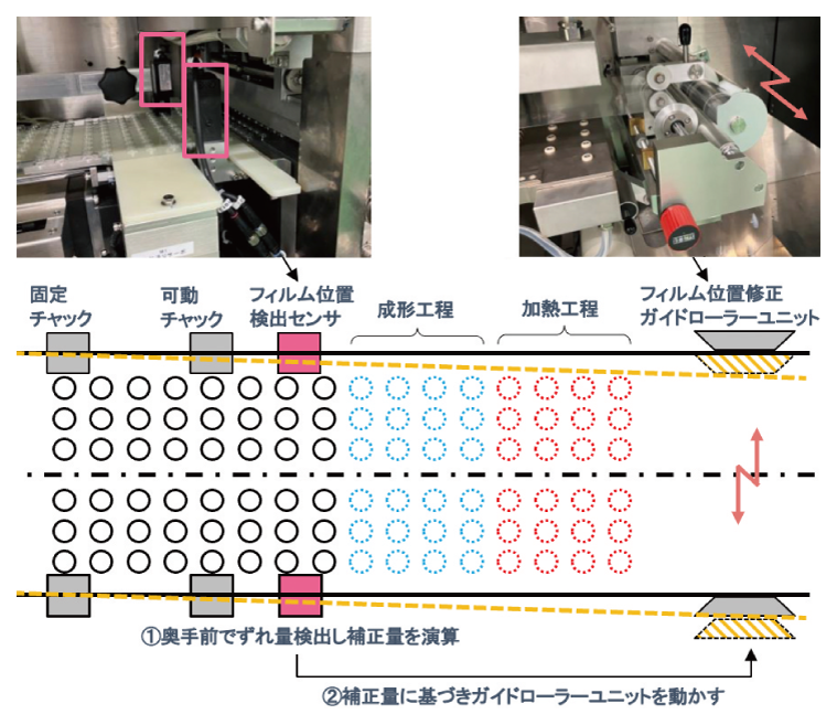 しかし、エコスクラップ®技術では両端のスクラップが存在せず、容器フィルム端面までがPTPシートの製品範囲となるため、従来の製造工程では品質を維持するのが難しくなる。先に述べた課題を解決するために、容器フィルムの蛇行を抑制する高精度な自動修正技術や、熱伸縮を最小限に抑える加熱方式の導入が必要である。