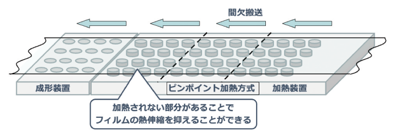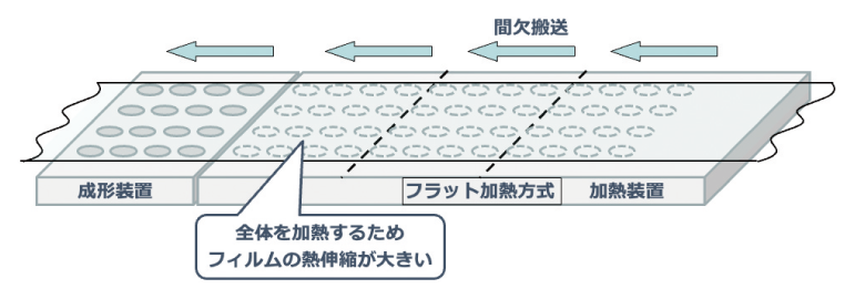 従来は、使用する容器フィルム材料に応じて、フラット加熱方式(Fig. 8)とピンポイント加熱方式(Fig. 9)を使い分けていた。フラット加熱方式はフィルム全体を加熱するため、専用設計を必要とせず汎用性が高いという利点がある一方で、加熱範囲が広くなることで熱伸縮も大きくなりやすいという欠点がある。ピンポイント加熱方式は成形に必要な最小範囲だけを加熱し、非加熱部が補強材となってフィルム伸縮を抑制できる。