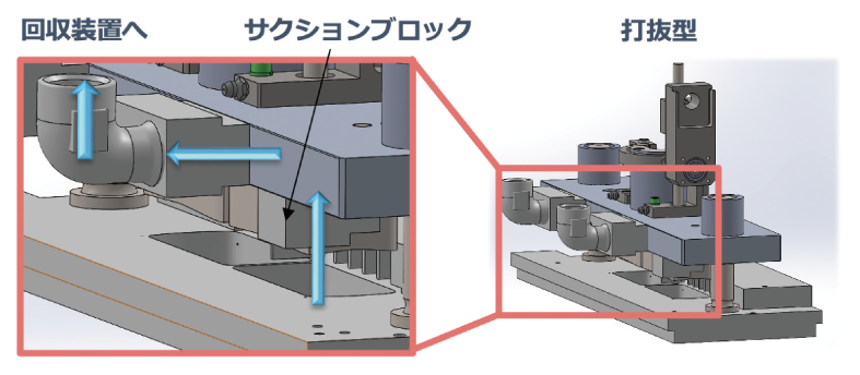 三角スクラップの確実な回収を目的に、サクションブロック(吸引機構)を一体化したパンチ構造を開発した(Fig. 12)。三角スクラップがパンチにより切り離される瞬間に吸引することで、三角スクラップの飛散を防止している。初期試作では、エアブローで三角スクラップの挙動をアシストしつつ、装置外側から吸引する方法を検証したが、三角スクラップが飛散し、完全回収には至らなかった。そこで、パンチ部にサクションブロックを隙間なく密着させ、三角スクラップが切り離される瞬間に吸引する構造へと改良した。この構造により、三角スクラップが空中へ飛散する前に確実に回収できるだけでなく、吸引経路を最短化することで負圧の減衰を抑制し、最終的に当社製ブリスター包装機 FBP-600Eシリーズにおいても三角スクラップの回収漏れゼロを達成している。サクションブロック付きパンチ構造は実際の製造ラインに導入されており、量産条件下においても三角スクラップの安定した回収が確認できた。