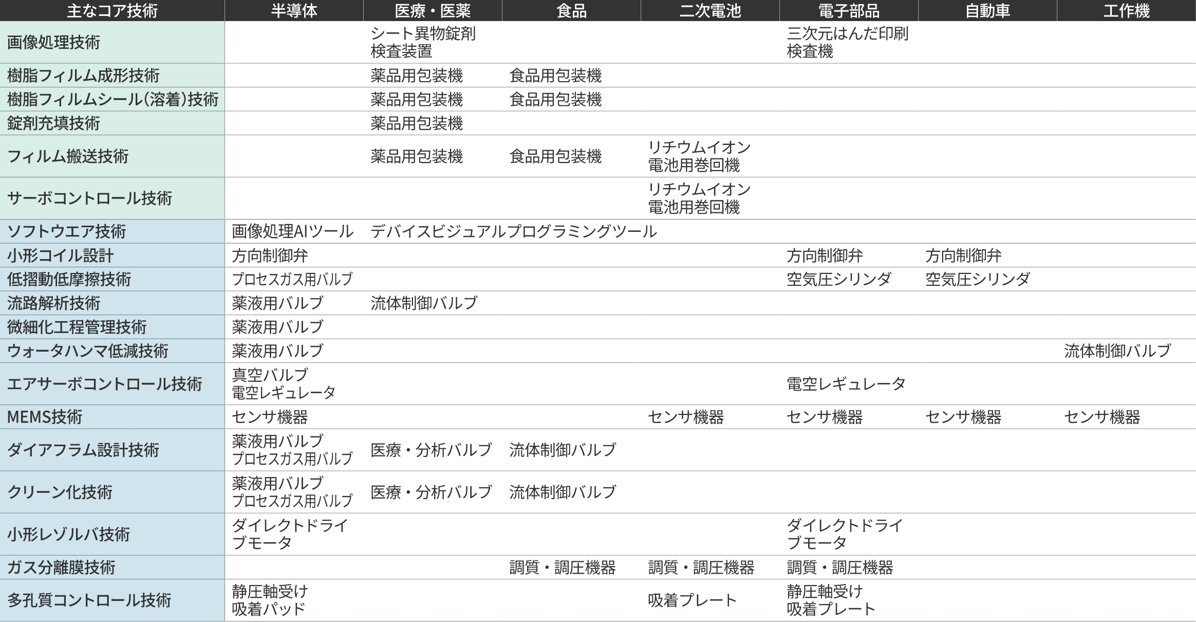 当社の商品は、自動車、半導体、医療・医薬、食品など幅広い産業分野で使用されています。当社の技術を活用し、お客様やサプライヤーなどステークホルダーの皆様と共創することで、高精度、高品質、省エネ、クリーン、小型化、高速、高頻度、高寿命の実現など、社会の様々な要望に応えています。