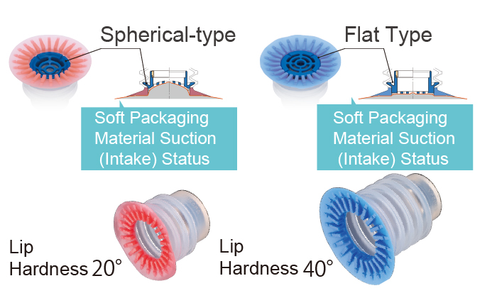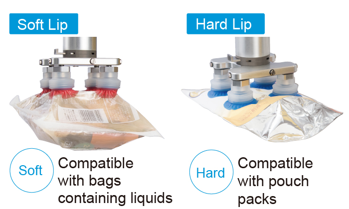 The extra-soft material (pink) is for easily deformable packaging bags and is ideal for gripping bags containing liquids, while the soft material (blue) is for thick vinyl or sheet-like packaging bags and is ideal for gripping pouches.