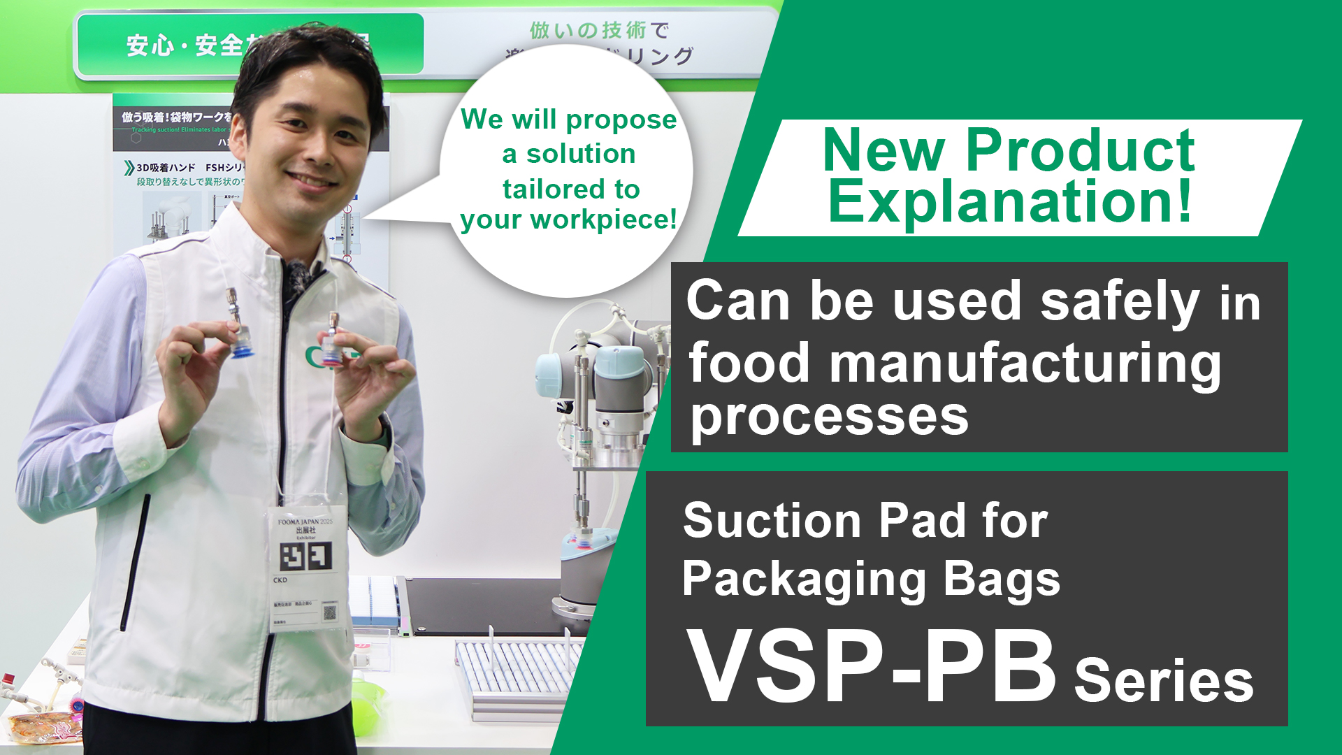 Introducing dedicated suction pads that can be used safely and securely in food manufacturing processes, such as the VSP-□PB Series for suction of liquid-filled bags and pouches, and the VSP-□BE/BD Series which prevents foreign object contamination in the event of pad damage.