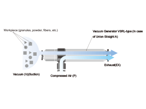 Workpieces are suctioned from the intake port, pass through the inside of the vacuum generator, and are discharged from the exhaust port, enabling transfer through tubing.