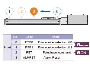 Three operating modes are available—Solenoid Valve Mode (Single Type), Simple 3-Point Mode, and 4-Point Mode—enabling positioning at up to four points. In 4-point mode, you specify a point number using the point number selection bits, and the actuator moves when the point movement command signal is turned ON. If the signal is turned OFF during operation, the actuator will decelerate to a stop.