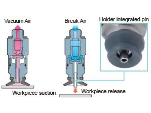 Pushes out a pin built into the holder with vacuum break air to release the workpiece. Prevents the workpiece from being blown away during release.