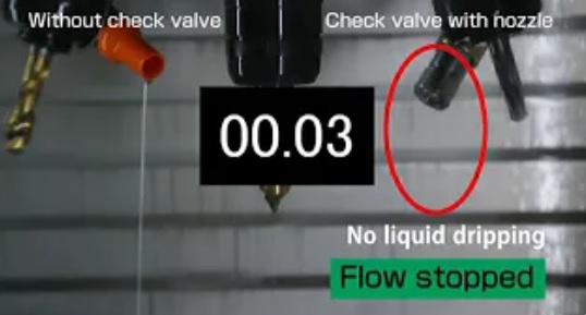 By preventing the drippings of coolants, cleaning liquids, cooling water, etc., a smooth transition to the next process becomes possible. As a result, a contribution to improved workability and reduced tact time is achieved. The nozzle has been compactly integrated into the check valve. We have OUT side connections lined up including nozzles, and male/female threads for various applications.
