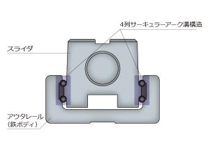 鉄ボディ、U字形状のアウターレールガイドを採用し、荷重・モーメントに強い構造。