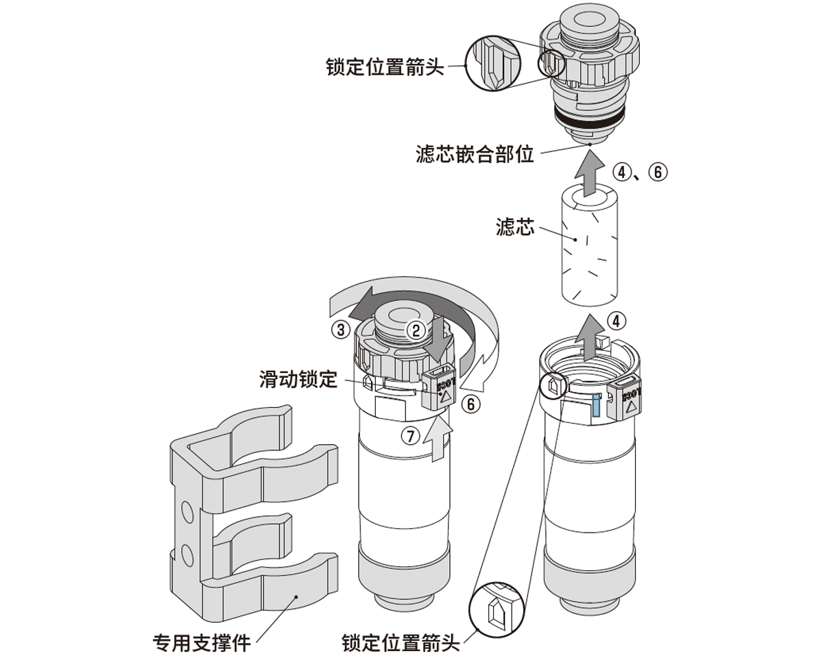 CKD的FSL系列采用无需工具的设计,只需解除滑动锁定并旋转,即可完成滤芯更换。