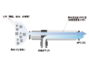 由吸气孔吸附工件然后再穿过真空发生器内部,通过排气孔排出。这样,通过软管也可进行工件搬送。