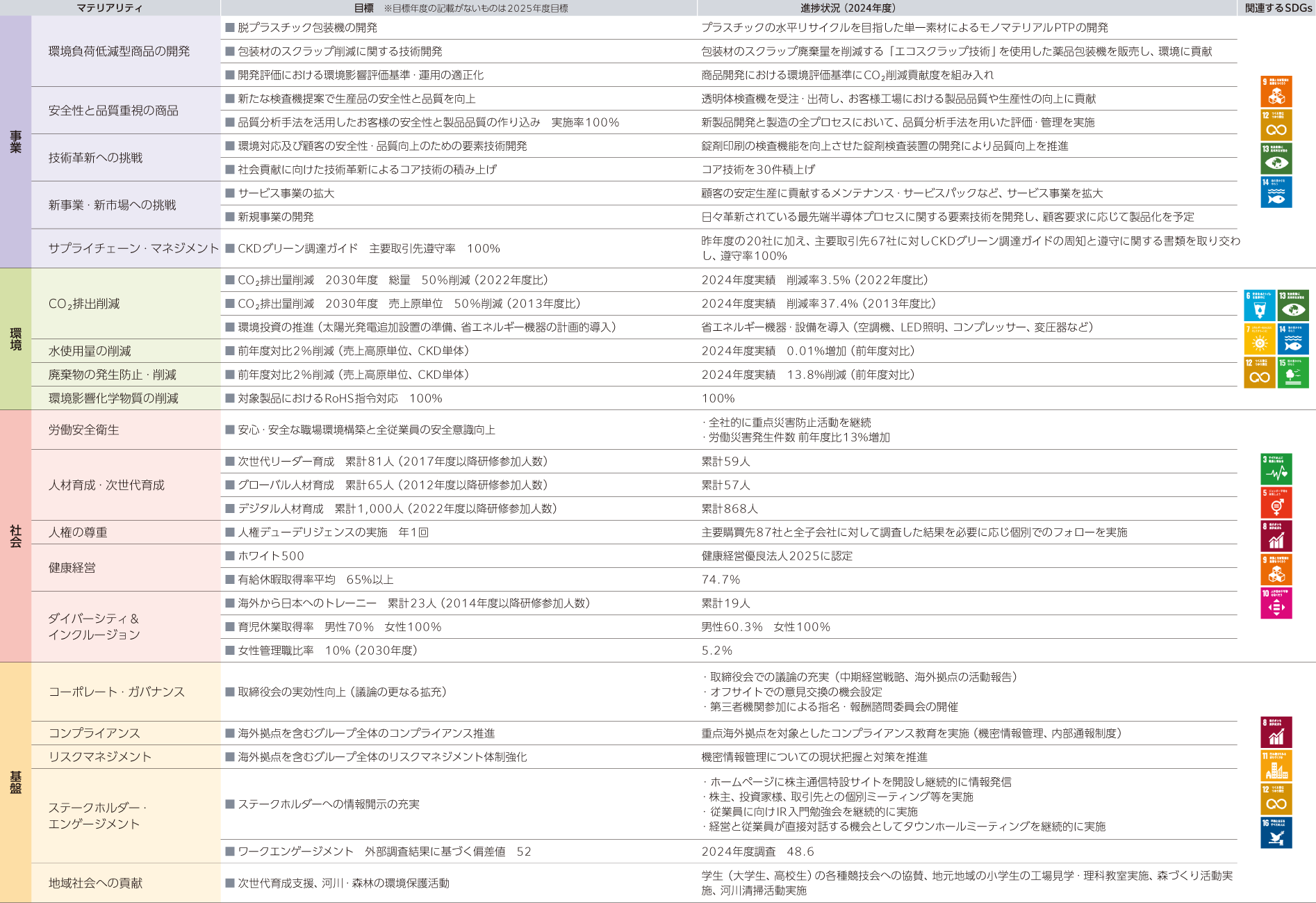 CKDグループは、Purposeの実現に向け、社会課題の解決を通じて社会とともに持続的に成長するためのマテリアリティ(重要課題)を特定しました。事業活動を通じてこれらの課題に取り組み、企業価値の向上に努めてまいります。